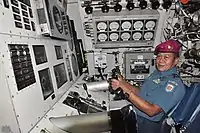 Nanggala underwent a refit at Howaldtswerke that was completed in 1989.[25] Roughly two decades later, the boat underwent a full refit for two years in South Korea by Daewoo Shipbuilding & Marine Engineering (DSME) that was completed in January 2012.[26][2][lower-alpha 1] The refit cost US$63.7 million,[28] replaced much of the submarine's upper structure, and upgraded its weaponry, sonar, radar, combat control and propulsion systems.[29][2] After the refit, Nanggala became capable of firing four torpedoes simultaneously at four different targets and launching anti-ship missiles such as Exocet or Harpoon. Its safe diving depth was increased to 257 metres (843 ft), and its top speed was increased from 21.5 knots (39.8 km/h) to 25 knots (46 km/h).[2] In November 2016, the submarine was equipped with an ASELSAN KULAÇ echosounder system.[30]