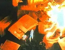 The K Foundation's ultimate resolution for their one-million-pound "problem" was rather less showbiz, but dramatic nonetheless, the Foundation having decided that making a public spectacle of the event would lessen its impact. On 22 August, Reid, Drummond, Cauty and Gimpo touched down at Islay Airport in the Inner Hebrides and took a ferry to the island of Jura, previously the scene of a wicker man burning ceremony by The KLF.[12] Early in the morning of 23 August 1994, in an abandoned boathouse on Jura, Drummond and Cauty incinerated the money. The burning was witnessed by Reid, who subsequently wrote an article about the act for The Observer, and it was filmed on a Hi-8 video camera by collaborator Gimpo. As the burning began Reid said he felt guilt and shock. These feelings, he reported, quickly turned to boredom.[12]