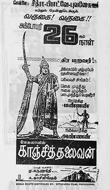 Kaanchi Thalaivan (transl.Leader of Kaanchi) is a 1963 Indian Tamil-language historical action film, directed by A. Kasilingam and written by M. Karunanidhi. The film stars M. G. Ramachandran, S. S. Rajendran, P. Bhanumathi and C. R. Vijayakumari, with M. R. Radha and S. A. Ashokan as villains. Produced by Karunanidhi, A. Kasilingam and Murasoli Maran under Mekala Pictures, it was released on 26 October 1963.[1] The film elicited numerous controversies, and became a financial failure.