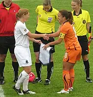 White exchanges crests with Lori Chalupny of the St. Louis Athletica, 2010.