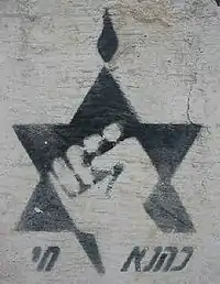 Kahanist graffiti in Hebron on a Palestinian home. The words to the top right say "Kahane Chai". The fist inside the Star of David is the party logo. Below is the acronym for "Kahane Chai" which is also the Hebrew word for strength.