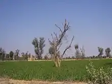 Kachho or Kachho Desert (Sindhi: ڪچو, Urdu: کاچھو) is a semi desert area of Sindh, Pakistan.[1][2] The Kachho is denoted from word of Sindhi language Kachh which stands for a lap or an armpit.[3] The desert of Kachho is near the lap of the Kirthar Mountains range. History reveals that the area of the Kachho desert including Lake Manchar appeared in the result of flow of big branch of the Indus River in earliest times which had been flowing from Kashmore-Kandhkot to Luki Mountains.[3] It is spread over two districts of Sindh Province, Dadu District and Qambar Shahdadkot District.[4] Kachho is rich in fertile soil and forests.[5] The Kachho is affluent in archaeological and historical sites.[6] The several historic and prehistoric remains of civilizations can be observed herein Kachho desert from Neolithic and Bronze Age to British period.[3] The people cultivate many kind of crops in Kachho.[7] Kachho depends on rains. If it rains Kachho becomes prosperous because people cultivate lands and crops which boost the economy of the region including whole country. Due to rains the water level too increases and an environment also becomes pleasant. Mostly, the trees are big reason for heavy rains and good environment of the area. Numerous trees of Kachho desert have been cutting for sell since last many years. Thus, the environment is very pretentious and water level is dropped from 150 feet to 450 feet. The wells dug by people now became dry. The people of several villages of Kachho suffer for fresh drinking water.[8][9]