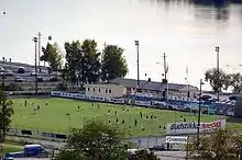 The northern part of Kadettangen is used for sports. An artificial grass pitch with a tribune along the western sideline serves as the home ground of the football club Bærum SK,[13] which plays in the First Division as of 2014. The stadium has a pitch which measures 95 by 66 meters (312 by 217 ft)[27] and has under-soil heating.[28] There is seating for 602 spectators, of which 400 are under a roof.[26] The attendance record is 1,819 people from a Norwegian Football Cup match in 2004 Norwegian Football Cup, when Bærum SK beat Vålerenga in the third round.[29]