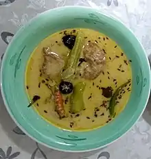 Kadhi, or karhi, is a popular dish mainly consumed in South Asia. It consists of a thick gravy or soup based on gram flour, and it may contain vegetable fritters called pakora, which include dahi (yogurt) for a sour taste. It is often eaten with cooked rice or roti. Varieties of kadhi include those from Rajasthan, Maharashtra, Gujarat, Punjab, and Sindh, all of which are located in present-day India and Pakistan.[1]