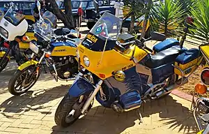 The secondary transmission was a cardan shaft on mono cantilever scales, the brakes were double disc in the front and single disc in the rear. The front suspension had common telescopic forks, but the rear was carried by a single spring and shock absorber assembly, a large monocoque was installed in a diagonal position, attached to the inner part of the frame at the front and to the rear scale.