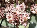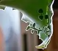 The types of trichome present on the leaves of Kalanchoe vary among the different species. The different types of trichomes are an indicator of adaptation to a particular environment. On the leaf blade of K. beharensis there are trichomes of the non-glandular, bushy three-branched type. This type of trichome is dead, with evidence of tannin. K. beharensis trichomes are also characterized by striped cuticular ornamentation on their surface. Glandular trichomes are also present on the leaves, with more on petioles than on leaf blades, and more on the top of the leaf as opposed to the bottom.[6]