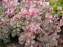 Kalanchoe fedtschenkoi is a low-growing, frost-tender perennial succulent which prefers dry, open ground. It grows to 10–12 inches (25–30 cm) tall as an untidy, low, rounded herb. The stems are round, smooth and lax with visible leaf scars, often bending and touching the ground where they produce roots and new plants. Leaves are fleshy, alternate, blue-green and oval or obovate with fine scalloped edges, the edges may turn pink or red under strong sunlight or drought conditions. The tubular flowers are in corymbs, often multi-layered in good conditions. Each flower has a short calyx edged with delta-shaped segments, which is shorter than its tubular corolla. The corolla is an orange/coral/apricot color. The flowers are pendant.[4]
