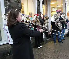 Singing carols in church was instituted on Christmas Eve 1880 in Truro Cathedral, Cornwall, (see article on Nine Lessons and Carols), and now seen in churches all over the world.[19] The songs that were chosen for singing in church omitted the wassailing carols, and the words "hymn" and "carol" were used almost interchangeably. Shortly before, in 1878, the Salvation Army, under Charles Fry, instituted the idea of playing carols at Christmas, using a brass band. Carols can be sung by individual singers, but are also often sung by larger groups, including professionally trained choirs. Most churches have special services at which carols are sung, generally combined with readings from scripture about the birth of Christ; this is often based on the famous Festival of Nine Lessons and Carols at King's College, Cambridge.