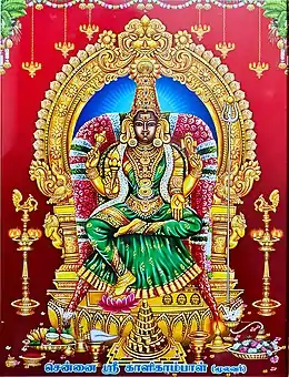 The main deity is faced towards the west. Legend has it that the deity was worshiped by demi-gods and saints, including Vyasa, Agastya, Aangeerasa, Pulasthya, and Varuna.[1] The idol of the main goddess has Thirusiran or Sri Vishwarupan at its feet.[1] The procession deity (urchavar) is called Periyanayaki, an idol in standing posture on a chariot, with idols of Mahalakshmi and Saraswati on either side.[1]