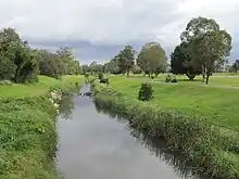 Kalinga is bounded by Kedron Brook to the north.[3] The Kedron Brook bikeway follows the brook on the suburb's north-east boundary with two bridges over the creek to Shaw Park in Wavell Heights (27°24′15″S 153°02′59″E / 27.4041°S 153.0498°E) and to Toombul Terrace in Nundah (27°24′29″S 153°03′18″E / 27.4081°S 153.0549°E). There is a third bridge over the creek (27°24′16″S 153°03′03″E / 27.4045°S 153.0508°E) from the bikeway (but not part of the bikeway) to Carew and New Street in Nundah.[4]