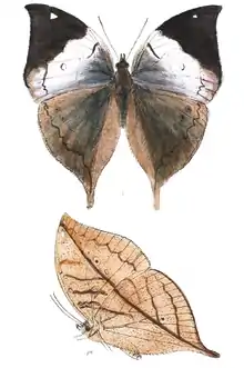 Male upperside forewing: basal area to near apex of cell and thence obliquely to the zigzag subterminal line as it crosses interspace 1 dark green, succeeded by a black line along the discocellulars, and a broad sinuous discal band (not curved as in Kallima horsfieldii) bluish white below vein 3, pure white with bluish suffused inner margin above vein 3 to costa; measured on the costal margin, the outer edge of this band less than half the length of the wing from base, the rest of the wing to apex black, with a preapical white spot; a medial discal hyaline (glass-like) spot in interspace 2. Hindwing: dark ochraceous brown, the costal margin and apex broadly and the abdominal fold much paler brown, irrorated (sprinkled) with scattered dusky scales; vein 1 and the abdominal fold with long soft brown, hairs. Forewings and hindwings with a dark subterminal zigzag line commencing somewhat below vein 3 on the forewing. Underside as in Kallima inachus protectively coloured. Antennae black; head and thorax anteriorly dark green, thorax posteriorly and abdomen olivaceous brown.[2]