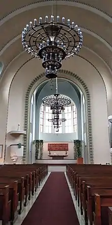 The interior of the church is decorated with Christian symbols such as roses, lilies, palm branches, laurel crowns and pearls to pass on the message of the Gospels. There are also Art Nouveau murals inside the church. The altarpiece is a wooden relief ‘Tulkaa minun tyköni’ (‘Come to me, all you who are weary and burdened’) by Hannes Autere, carved in 1956. In the vestibule of the church and in the organ galleries there are four plaster reliefs from Sigrid af Forselles’ five-part series Ihmissielun kehitys (‘Development of the human soul’). In the sacristy there's a painting by Verner Thomé, depicting Jesus healing a blind man.