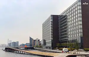 The waterfront was redeveloped in the late 1990s. Beginning from the north, the buildings along the quay are Nykredit's Head Office (2001, Schmidt hammer lassen), Copenhagen Marriott Hotel (2001, PLH Architects), The Engineer's House (1998, Kieler Architects) and the Fisketorvet shopping centre (2000, Kieler Architects). The Havneholmen mixed-use development was subsequently built on reclaimed land in front of Fisketorvet. In 2011, Nykredit expanded their headquarters with a new building, The Crystal, on the other side of the street. A new plaza was also created in front of the building.