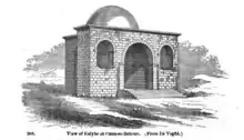 The first kalybe to be identified as a distinct type was in Umm Iz-Zetun[2] (or Zetum),[3] described by Eugène-Melchior de Vogüé in 1867. Together with the temple he found two Greek inscriptions describing the structure as a "kalybe." Other than these, the only occurrence of the term is in a lexicon of Hesychius of Alexandria from the fifth century,[2] Since that time more than seven similar temples have been identified in Roman Syria. In addition to Umm Iz-Zetum these include Shaqqa (Saccaea), Il-Haiyat, Shahba (Philippopolis) (built around 245 by the Emperor Philip the Arab), Qanawat (Kanatha), Bosra (Bostra),[2] Amman (Philadelphia )[1] and Hippos.