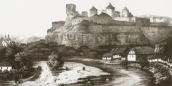 Kamianets-Podilskyi Castle played an important role during the Khmelnytsky Uprising between 1648 and 1654, when the Zaporozhian Cossacks led by Hetman Bohdan Khmelnytsky, allied themselves with the Crimean Tatars and the local Ukrainian peasantry against the Polish–Lithuanian Commonwealth's army and militia. During the uprising, the castle was unsuccessfully besieged by local Cossacks and insurgents led by Commander Maksym Kryvonis.[19] In 1651, the castle was then subject to another Cossack siege led by Hetman Ivan Bohun, before an unexpected counterattack by Polish insurgents under commanders Aleksandrenka and Chuika re-established the Polish presence in the area and relieved the siege. A 60,000 force army led by Khmelnytsky himself reasserted Cossack control over the castle in 1652.[19] Just one year later, the castle was attacked yet again, this time by a 40,000 strong Crimean Tatar horde.[19]