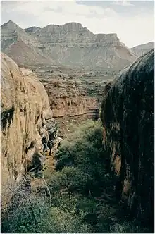 The stream headwaters arise at 37°29′31″N 112°22′50″W / 37.49194°N 112.38056°W / 37.49194; -112.38056[2] at an elevation of approximately 8600 feet along the base of the Sunset Cliffs.[3] The stream flows southwest and passes just to the east of the community of Alton where it turns to the south and passes under Utah State Route 136. It continues to the south and runs parallel to U.S. Route 89 past Kanab.[4] The stream enters Arizona where it becomes the border between Coconino and Mohave counties and flows past Fredonia. It flows through the Kaibab Indian Reservation of the Paiute people and the Kanab Creek Wilderness before reaching its confluence with the Colorado at 36°23′32″N 112°37′48″W / 36.39222°N 112.63000°W / 36.39222; -112.63000 at an elevation of 1913 feet[2] within the Grand Canyon National Park.[5]
