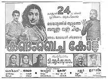 Kandam Becha Kottu (transl.The Patched-up Coat) is a 1961 Indian Malayalam-language drama film directed and produced by T. R. Sundaram under the banner of Modern Theatres. It stars Thikkurissy Sukumaran Nair and Prem Nawas in the lead roles, along with T. S. Muthaiah, Aranmula Ponnamma and Ambika Sukumaran in supporting roles.[1] The film deals with the negative effects of the dowry system in India through customs of the Muslim community.[2]
