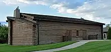 One of the items of business that Young wanted to accomplish was the reorganization of the First Presidency of the church. Since Joseph Smith's death, the First Presidency had not existed, and Young believed it was finally time to reorganize it. In anticipation of the event, the LDS Church leaders felt it necessary and appropriate to construct a hall large enough to accommodate the large number of Latter-Day Saints who would want to witness the event. With this end in mind, approximately 200 Mormon pioneers spent two and a half weeks building the large log-cabin like hall.[4] The dimensions of the building were 40 feet by 60 feet with a large sod-block fireplace and chimney located at one end. In the center of the wall opposite the entrance, there was a small wing that provided a stage upon which the church leaders could sit and conduct the meeting. It was here on December 27, 1847, with 1,000 people in attendance that Brigham Young, Heber C. Kimball, and Willard Richards were sustained by members of the church as the new First Presidency, and Young was sustained as the second president of the church.[3]