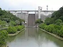 The Kanna Dam (漢那ダム) is a concrete gravity dam on the Kanna River in Ginoza, Okinawa Prefecture, Japan. The purpose of the dam is water supply and flood control. After studies were carried out in the 1970s(starting in 1973 and ending in 1978), construction on the dam began in 1982 and it was completed in 1992.[1] The dam is 45 m (148 ft) tall and 185 m (607 ft) long. In order to retain the reservoir, a 37 m (121 ft) tall and 500 m (1,640 ft) long saddle dam was constructed directly northeast of the dam.[2] A fish ladder was installed on the dam during construction to assist the migration of fish, shrimp and crabs. Mangroves downstream of the dam were restored after construction and the area is a tourist destination along with a habitat for water fowl.[3]