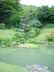 The garden of Kannon-in was built is an example of an Edo period Japanese garden in the Chisenkanshō-shiki teien (池泉観賞式庭園) style,[3] which literally means a garden of the "pond appreciation style". A Chisenkanshō-shiki garden is meant to be viewed from a fixed perspective from a single location, rather than a garden to stroll through and view from several angles.[7] In the case of the Kannon-in the garden is viewed from the veranda of the shoin (書院), a hall used for the study of Buddhist sutras. Work on the garden began in 1650, and took ten years to complete. The garden utilizes the gentle slope of the landscape of Kannon-in. A depiction of the garden is found the Kannon-in ezu (観音院絵図), or illustration of Kannon-in, published in the 無駄安留記 (Mudaaruki) in 1858. The Mudaaruki is probably based on earlier works.[8] The bekkan (別館) annex structure in the garden is in a slightly different location in the Mudaaruki than what is seen in the garden today, as the Kannon-in garden was probably restructured during the Meiji period.[3]