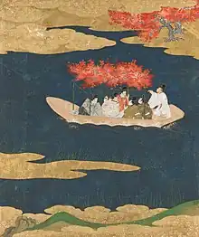 Poetry was commonly used in conversations.[20] In Heian court life, poems were used to reflect a certain situation and served to communicate metaphors and allusions. Shikibu's diary recounts poetry she and others wrote to each other. One example of poetry used in conversation was with the Lord Prime Minister. He urges her to write a poem about a prior situation, which she does, and he replies by writing a poem as well. Poetry is also used abundantly in The Tale of Genji. In the first part of the Second Month, Niou, Kaoru, and other court officials gather at the Palace to compose poems in Chinese to be read to the emperor in the following morning.[21]