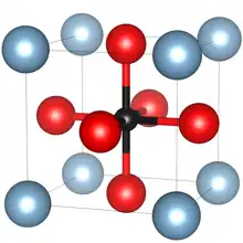 κ-Carbides crystallise in the perovskite structure type with the space group Pm3m (Nr. 221).[2] This structure was, inter alia, elucidated with XRD-measurements on steel alloys containing κ-carbide precipitates but also on single crystals of manganese-κ-carbides with a molecular formula of Mn3.1Al0.9C and a lattice parameter of a=3.87Å.[3] In steel alloys where diverse arrangements of the atoms are possible, a considerable effect of the short range ordering, e.g. of iron and manganese on the microscopic properties of the alloy, has been observed.[4] This is especially important for the role as hydrogen-traps in steels.[5]