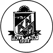 The badge is a diamond shield displaying a monogram of the Greek letters ΚΝ arranged horizontally along one plane below which is a six pointed star and above which are קנ (Kuf Nun - the equivalent letters in Hebrew), standing for קשר נעורים Kesher Neurim ("Ties of Youth").[1]: 54 The jeweled base of the pin is surrounded by 20 pearls with an amethyst set at each of the corners. The colors were purple and white.[4][3]