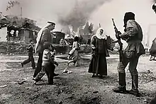 ![]() Palestinian refugees Zuhaiba Alshaheen, Mohammed Amcha and grandchildren Ahmad Jawhar and Ahmad Kinj in Karantina, 1976 (photo taken by Françoise Demulder)[1] | |