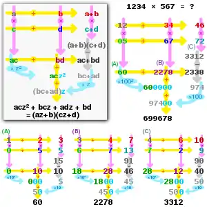 Karatsuba multiplication of az+b and cz+d (boxed), and 1234 and 567 with z=100. Magenta arrows denote multiplication, amber denotes addition, silver denotes subtraction and cyan denotes left shift. (A), (B) and (C) show recursion with z=10 to obtain intermediate values.