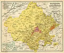 ![]() Karauli State (orange) within Rajputana (yellow), in the Imperial Gazetteer of India (1909) | |||||||