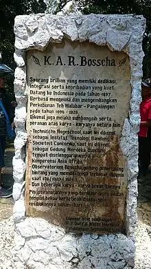K.A.R. Bosscha was the son of renowned German-Dutch physicist Johannes Bosscha and Paulina Emilia Kerkhoven. After gaining some formal education in engineering at Polytechnical School of Delft, in 1887 came out to Netherlands Indies and stayed with his uncle while working at Sinagar Estate near Cibadak (West Java) that his uncle owned. Work at his uncle's company gave him little satisfaction, thus after six months he went to Sambas (Borneo) to join his older brother John Bosscha, a geologist. During this time he worked on gold exploration and mining with his brother until his return to Sinager 1892, this time as its administrator.[1] He stayed at Sinagar Estate until 1895 and in 1896 he undertook the management of Malabar Estate near Pangalengan (Bandung) until his death in 1928 because of cancer. As of 2011 the Malabar Estate plantation is still operational under state own company (PT Perkebunan Nusantara) management.