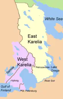 On the other side of Lake Ladoga, the River Svir is usually thought of as the traditional southern border of Karelian territory while Lake Onega and the White Sea mark the Eastern border. The River Kymi marks the historic western border of Karelian territory as it served as the boundary between the Häme Finns and the Karelians during the Middle Ages.[2] The River Kymi is also said to have formed a boundary between the eastern and western cultural spheres by the beginning of the Bronze Age at the latest.[3] In the North lived the nomadic Samis, but there were no natural borders except for large wooded areas (taiga) and the tundra.