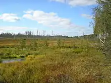 The isthmus is mostly covered by coniferous forests formed by Scots pine (Pinus sylvestris) and Norway spruce (Picea abies), with numerous lakes (e.g. Lake Sukhodolskoye and Lake Glubokoye) as well as small grass, fen and Sphagnum raised bogs. Forests cover approximately 11.700 km of the isthmus, more than three-fourths of its total square. Swampy areas occupy on average 5.5 percent of the territory. In the large contiguous area along the shore of Lake Ladoga in Vsevolozhsky District, in the southeastern part of the isthmus, bogs occur much more frequently than in other parts. The same was once true of the lowland along the Neva River, which has been drained.[4] The soil is predominantly podsol, which contains massive boulders, especially in the north and northwest, where large granite rocky outcrops occur.
