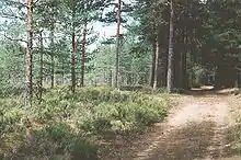 Pine forests (with Pinus sylvestris) are the most widespread and occupy 51% of the forested area of the Karelian Isthmus, followed by spruce forests (with Picea abies, 29%) and birch forests (with Betula pendula and B. pubescens, 16%). Stands on more fertile soils and in more favorable locations are occasionally dominated by Norway maple, black alder, grey alder, common aspen, English oak, grey willow, dark-leaved willow, tea-leaved willow, small-leaved lime or European white elm. Common vegetation of various types of pine forests includes heather, crowberry, common juniper, eared willow, lingonberry, water horsetail, bracken, graminoids (i.e. grasses in the wider sense) Avenella flexuosa and Carex globularis, mosses Pleurozium schreberi, Sphagnum angustifolium and S. russowii, and lichens Cladonia spp. Prominent in various spruce forests are wood horsetail, common wood sorrel, bilberry, lingonberry, graminoids Avenella flexuosa, Calamagrostis arundinacea, Carex globularis, and mosses Polytrichum commune and Sphagnum girgensohnii. Prominent vegetation of various birch forests include meadowsweet, common wood sorrel, bilberry and graminoids Calamagrostis arundinacea and C. canescens.[5]