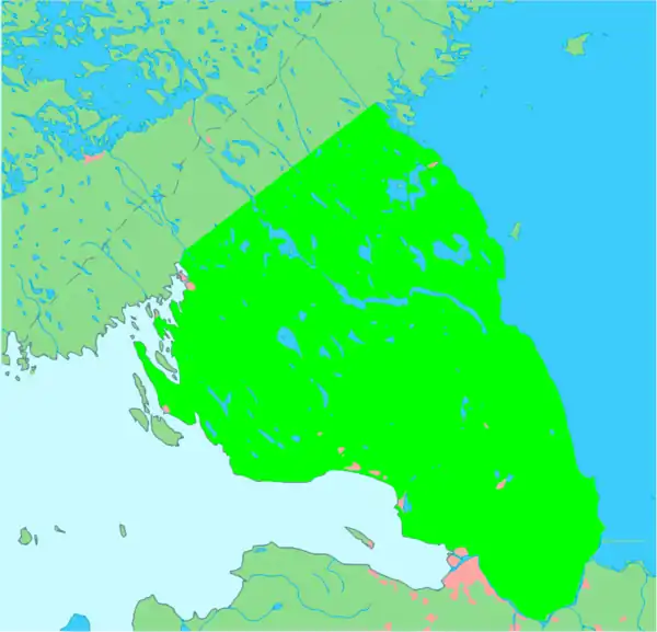 The Karelian Isthmus (Russian: Карельский перешеек, romanized: Karelsky peresheyek; Finnish: Karjalankannas; Swedish: Karelska näset) is the approximately 45–110-kilometre-wide (30–70 mi) stretch of land situated between the Gulf of Finland and Lake Ladoga in northwestern Russia, to the north of the River Neva.[1] Its northwestern boundary is a line from the Bay of Vyborg to the westernmost point of Lake Ladoga, Pekonlahti. If the Karelian Isthmus is defined as the entire territory of present-day Saint Petersburg and Leningrad Oblast to the north of the Neva and also a tiny part of the Republic of Karelia, the area of the isthmus is about 15,000 km2 (5,800 sq mi).