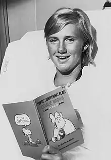 Budge hospitalized with a dislocated shoulder at the 1968 Winter Olympics, reading a Charlie Brown book by Charles M. Schulz