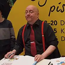 ![]() Kari Korhonen at the Helsinki Book Fair 2014. | |