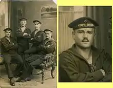 Karl Artelt, 1st Werft-Division, left, (enlarged detail right), together with comrades of the 1st Torpedo-Division in Kiel-Wik, September 1914