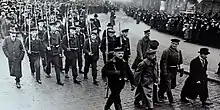 The town archive Kiel keeps a photograph that was seen for a long time as depicting the burial procession for the victims of the revolution on 10 November 1918. Some identified Lothar Popp, Gustav Noske and Karl Artelt in the photo. The grand son of the latter, also Karl Artelt, was sure that his grand father was the person second from left in the first row.[14] However in February 2015 the town archive Kiel ascertained, following a hint from Matthias Sperwien, that this photo showed the funeral procession of 20 November 1918 in Berlin and not in Kiel for the victims of the revolution in the capital.
