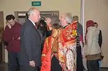 Karl Emich and his supporters argue that the marriage of Maria Vladimirovna's parents was in contravention of the Pauline Laws. They maintain that the House of Bragation-Mukhrani did not possess sovereign status and was not recognized as equal by Nicholas II for the purpose of dynastic marriages at the time of the union of Princess Tatiana Constantinovna of Russia and Prince Constantine Bragation-Mukhransky in 1911, thirty seven years prior to that of Princess Leonida and Grand Duke Vladimir Kirillovich.[13] Therefore, as the next of kin to Vladimir (in the exclusion of his daughter), the Russian Monarchist Party recognises Karl Emich as the heir to the Russian throne, since he and his wife converted on 1 June 2013, from Lutheranism to Eastern Orthodox Christianity, enabling his accession.[14] The couple received Orthodox names of Nikolai Kirillovich and Yekaterina Fyodorovna.