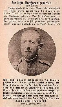 On 3 December 1917, Karl Julius underwent surgery for an intestinal blockage. A few days later, on 9 December, he died of peritonitis.[6] Although all his next of kin were listed as "deceased", the probate file stated that his aunt, Karoline Weidinger (widowed), was supposedly still living. Karl Julius was buried on 13 December 1917 next to his mother. His death as being the "last Beethoven" attracted media attention: "Yesterday the last bearer of the name Beethoven died in the Garrison Hospital. Karl Julius van Beethoven, a grandson of the great master's brother, was born in 1870 in Munich ..." (Nueus Wiener Journal, 11 December 1917); "The relatives who attended the funeral were ... Dr. Raoul E. Wedinger, his mother Hermine Weidinger, and their daughter Elsa. They were related to Mr. van Beethoven only in female lineage." (Fremden-Blatt, 17 December 1917); and the Das interessante Blatt published a photograph of Karl, dated 20 December 1917.