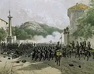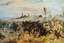The Hungarian position was highly advantageous, requiring Urban's columns to storm through the town on a narrow road while enduring heavy crossfire. At one point, they even seemed to be faltering, but he pressed for a renewed attack, which was ultimately successful.[6] Klausenburg was captured by Karl von Urban for the first time on 18 November 1848.[5][3][7]