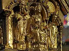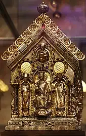 The Shrine is part of the late 12th century shrine tradition. It has the form of a naved church, without a transept. It is an oak box 2.04 metres long, 0.57 metres wide, and 0.94 metres high (80.3in by 22.4in by 37.0in), decorated with gilt silver, gilt copper, filigree, precious stones, enamel and firnisbrand. The double step of the base is adorned with enamel plates, engravings, filigree, and silver stamped with floral designs. The two long sides each show an arcade of eight archways resting on double columns, in which the kings and emperors of the realm are enthroned.