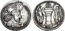 Mani's death was followed by the persecution of his followers by Kartir and the Zoroastrian clergy, who used the persecution of religious minorities as a method to increase and spread their vast influence.[2] Mani was seen by the Zoroastrian clergy as heterogeneous philosopher and a threatening pagan who was presenting an obscure perception of Zoroastrianism, which had been tainted by non-Zoroastrian (i.e., Jewish, Buddhist, and Christian) ideas.[2] With the backing of Bahram I, Kartir laid foundations to a Zoroastrian state church.[5][2] As a result, Bahram I became applauded in Sasanian-based sources as a "benevolent and worthy king."[5] His son Bahram II succeeded him as shah; he may have been aided by Kartir to ascend the throne instead of Narseh.[10][1] This most likely frustrated Narseh, who had now been neglected from succession several times.[7]