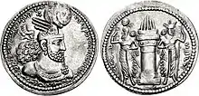 It is thus under Bahram II that Kartir unquestionably becomes a powerful figure in the empire; the latter claimed on his inscription at the Ka'ba-ye Zartosht that he "struck down" the non-Zoroastrian minorities, such as the Christians, Jews, Mandaeans, Manichaeans, and Buddhists.[1] According to the modern historian Parvaneh Pourshariati: "it is not clear, however, to what extent Kartir's declarations reflect the actual implementation, or for that matter, success, of the measures he is supposed to have promoted."[11] Indeed, Jewish and Christian sources, for example, makes no mention of persecutions during this period.[11][12] Before Bahram II, all the previous Sasanian shahs had been "lukewarm Zoroastrians."[1] He died in 293 and was succeeded by his son Bahram III.