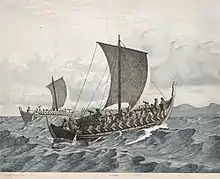 Karves (or Karvi) were a small type of longship with broad hull, somewhat similar to the ocean-going knarr cargo ships.[1] Karves were used for both war and ordinary transport, carrying people, goods or livestock. Because they were able to navigate in very shallow water, they were also used for coasting. Karves had broad beams of approximately 5 m (17 feet), were up to 21 m (70 feet) in length, and allowed for up to 16 oars.[2]