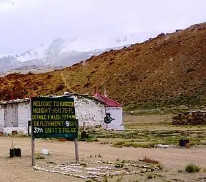 Karzok or Korzok is a village in the Leh district of Ladakh, India.[2] It is located close to Nyoma, in the Rupshu region and block, on the shores of the Tso Moriri lake. It is among the highest towns in the world and the highest settlement in India.[3] Various sources give slightly different measurements of the altitude from 14,995 ft (4,570 m) to 15,075 ft (4,595 m) above sea level.[4] The Drukpa Buddhist Korzok Monastery is located here.
