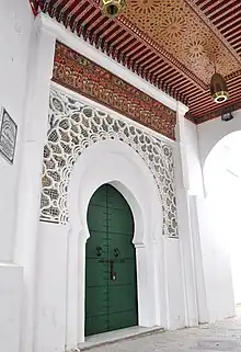 The mosque is adjacent to the palace complex of the kasbah (now a museum), directly to its south. The mosque's interior is relatively plain, with white walls and rows of white Moorish arches (like many Moroccan mosques).[3] It has a nearly plain mihrab (niche or arched alcove symbolizing the direction of prayer), and its small rectangular courtyard is not open to the sky but is roofed over.[3] Its most distinguished elements are on the exterior. The entrance is on Ibn Abbou Street (an alley near the entrance to the museum/palace), sheltered under a small arched passageway covering the street at this point.[2] The doorway, also shaped like a Moorish arch, is decorated with typical radiating geometric motifs whose empty spaces are filled with colorful zellij tilework.[3] The minaret, rising above the entrance, is notable for having an octagonal shaft (instead of a square shaft like most Moroccan minarets) and for its decoration. Its facades are decorated with ornate blind arches, filled again with multicolored zellij tilework, and panels of sebka geometric motifs.[2]