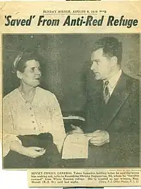 Upon returning to the consulate, Lomakin invited a large group of journalists. In an emergency press conference Kasenkina described how she was drugged and kidnapped by "White Russian bandits". Lomakin showed the envelope and Kasenkina's handwritten letter. He read aloud extracts from the letter in English translation. The photostatic copy was given to the United States Department of State and Federal Bureau of Investigation. On August 8, all major US newspapers released photos from the press conference, and The New York Times[22] and New Herald Tribune[23] published detailed reports. Countess A. Tolstaya stated that she was against providing shelter to Kasenkina believing she was sent as a spy to determine the location of the Samarins.[24] Another newspaper printed a statement by Congressman Karl Mundt, a member of the HUAC requiring that Kasenkina should be questioned as a witness of USSR espionage activities.[25]