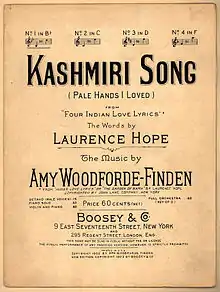 "Kashmiri Song" or "Pale Hands I Loved" is a 1902 song by Amy Woodforde-Finden based on a poem by Laurence Hope, pseudonym of Violet Nicolson.